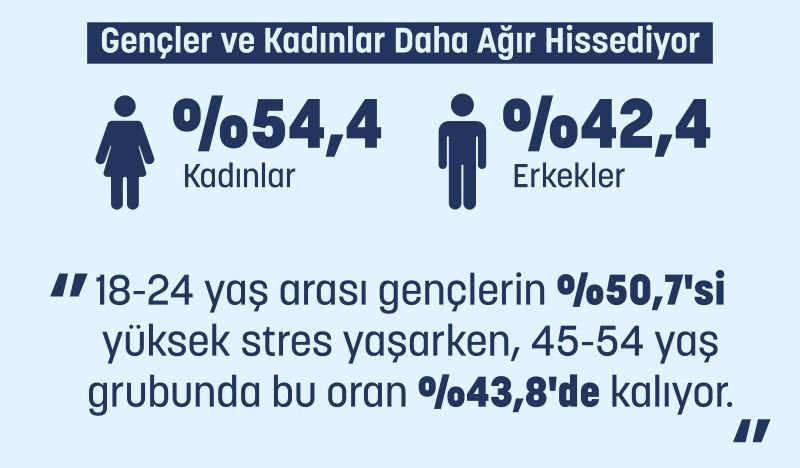 Araştırma sonuçları, stresin özellikle genç yaş gruplarında daha yoğun hissedildiğini gösteriyor. 18–24 yaş aralığında yüksek stres oranı yaklaşık yüzde 50,7 seviyesine ulaşırken, 45–54 yaş grubunda bu oran yüzde 43,8 seviyesinde kalıyor. Genç katılımcılarda ekonomik baskı ve gelecek kaygısının stres üzerindeki etkisi daha belirgin şekilde öne çıkıyor. Bu durum, stresin toplum genelinde yaygın olmakla birlikte yaşam evrelerine göre farklı yoğunluklarda deneyimlendiğini gösteriyor.