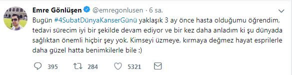 Kötü haberi 3 ay önce aldığını belirten Emre Gönlüşen, 4 Şubat Dünya Kanser Günü hashtagini kullanarak "Bugün #4SubatDünyaKanserGünü yaklaşık 3 ay önce hasta olduğumu öğrendim, tedavi sürecim iyi bir şekilde devam ediyor ve bir kez daha anladım ki şu dünyada sağlıktan önemli hiçbir şey yok. Kimseyi üzmeye, kırmaya değmez hayat esprilerle daha güzel hatta benimkilerle bile" mesajını paylaştı.