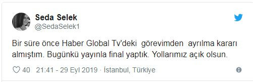 Bir süre önce Haber Global Tv'deki görevimden ayrılma kararı almıştım. Bugünkü yayınla final yaptık. Yollarımız açık olsun.