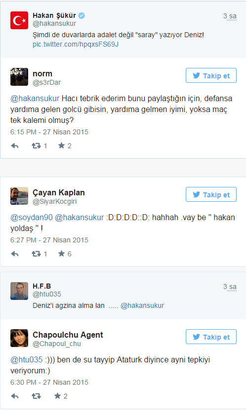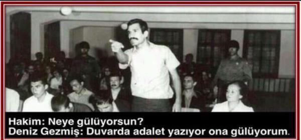 Hakan Şükür, Deniz Gezmiş'in mahkemede çekilen ve altında " Hakim : Neye gülüyorsun? Deniz Gezmiş: Duvarda adalet yazıyor ona gülüyorum" diyalogu bulunan fotoğrafını paylaşarak, "Şimdi de duvarlarda adalet değil 'saray' yazıyor Deniz!" diye yazdı.