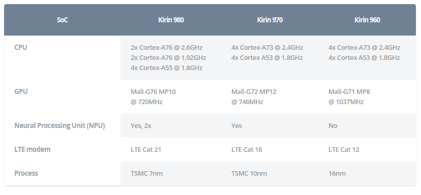 Santimetrekareye 6.9 milyar transistör sığdıran Huawei Kirin 980, bir önceki yonga seti Kirin 970 (10nm) platformuna kıyasla çok daha güçlü. Kirin 980, ARM’nin en yeni ve en yüksek performanslı Cortex-A76s, verimlilik üzerine planlanmış farklı yapıya sahip olan iki Cortex A76s; bu çekirdeklerin daha düşük versiyonu olan Cortex-A55’ten de 4 adet olmak üzere toplamda 8 çekirdek barındırıyor. Kirin 970’de de kullanılan ARM’nin Dynamiq teknolojisini kullanmaya devam eden Huawei, bu sekiz çekirdeğin tek bir bünyede sıkışmasını sağlıyor.