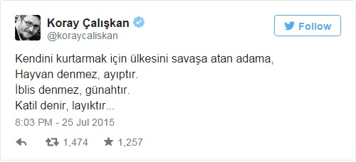 Türkiye Cumhuriyeti Cumhurbaşkanına, devletine ve kurumlarına karşı hakaret, küçük düşürme ve iftira suretiyle anayasal düzeni aşağıladığı iddiasıyla Boğaziçi Üniversitesi öğretim üyesi Doç Dr. Koray Çalışkan hakkında attığı tweet yüzünden Ankara Cumhuriyet Başsavcılığı'na suç duyurusunda bulunuldu.