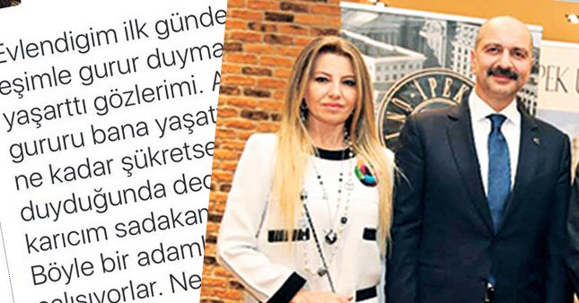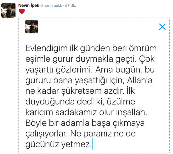 ÜZÜLME KARICIĞIM SADAKAMIZ OLSUN Nevin İpek, şirketlerine el konulmasının ardından eşinin tepkisini ise şu satırlarla dile getirdi;
